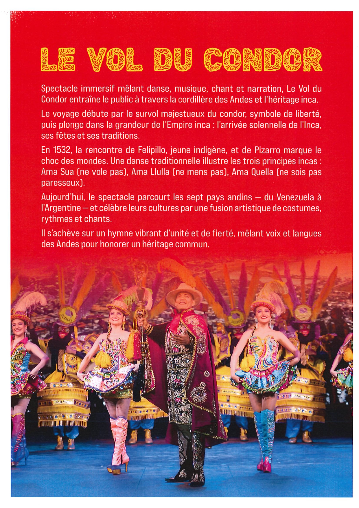 Partez pour un voyage inoubliable au cœur de l’Amérique du Sud avec “Le Vol du Condor”, un spectacle haut en couleurs qui célèbre la richesse culturelle des peuples andins.